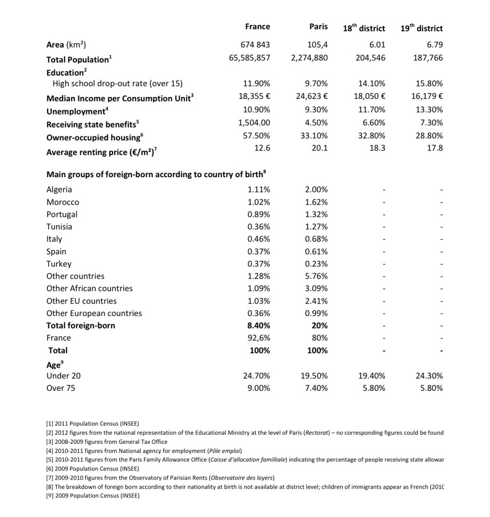 The selected neighbourhoods are Goutte d’or and Chapelle in the 18th district, and Flandres, in the 19th district. These areas have a high concentration of mixed, social and private low-rental housing. There are higher rates of foreign-born, unemployed and young people than the average Parisian population. With its long tradition of receiving newcomers since the 19th century, Goutte d’or has the highest rate of foreign-born (36,9%) and Flandres the largest increase of foreign-born over the past six years.